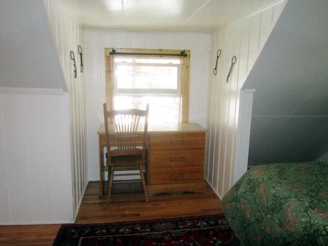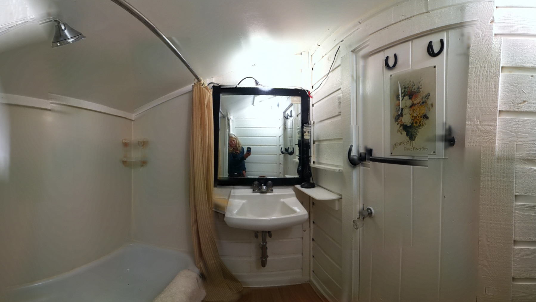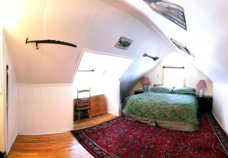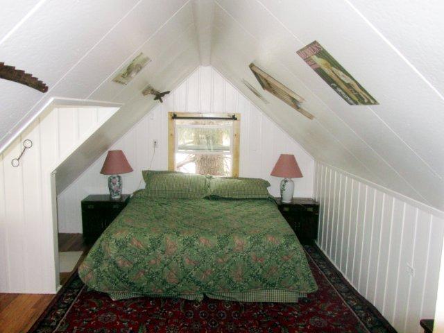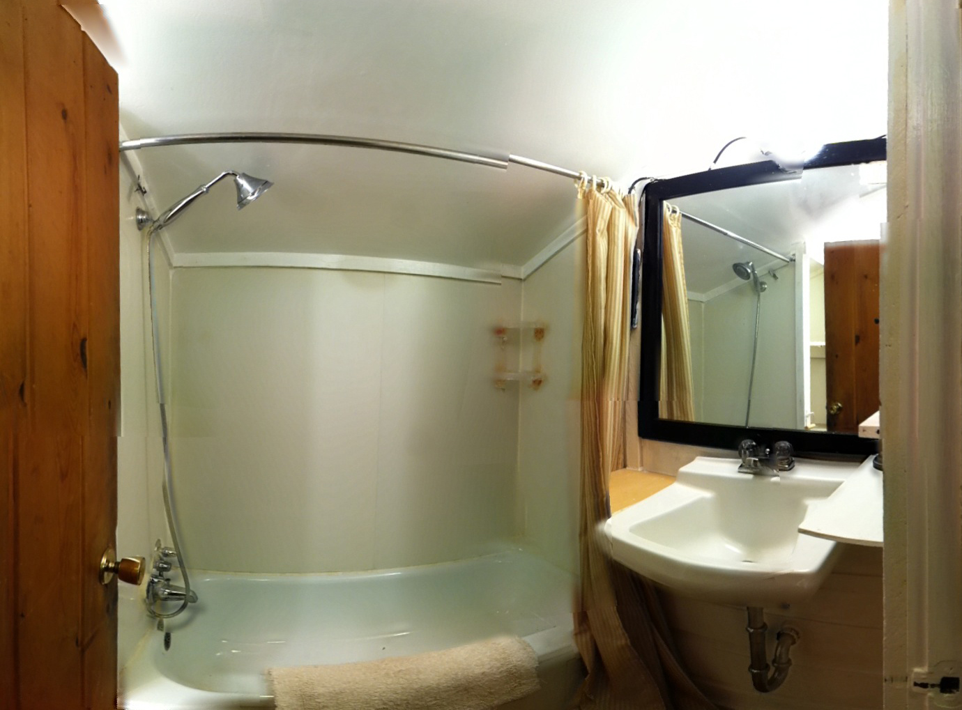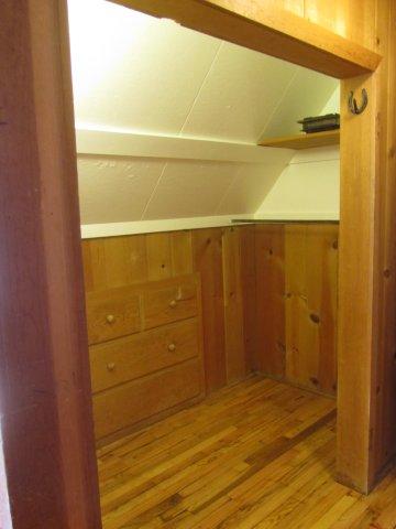 drawers. ![]() ![]() Wide angle perspective of the bedroom: ![]() Below, bedroom shown without furnishings. ![]() View from back of bedroom towards kitchen/living area shows closets to either side of the doorway. ![]() THE BATHROOM/ PANTRY Bathroom has full tub with flexible shower head . . . sloping roof makes it a challenge for very tall persons. ![]() ![]() ![]()