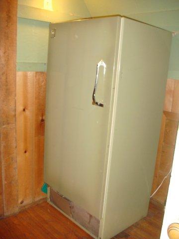 Across from the bathroom is a hall patry that contains a brand new fridge (not the rather historic refrigerator pictured below), and has space for more hanging items.