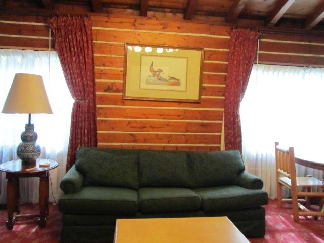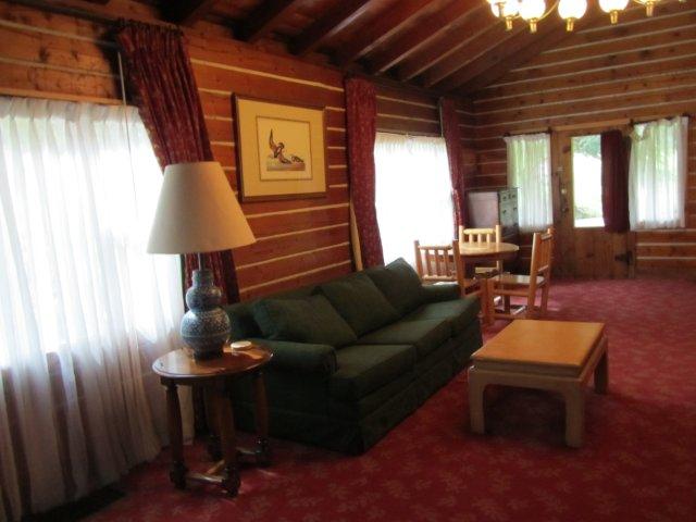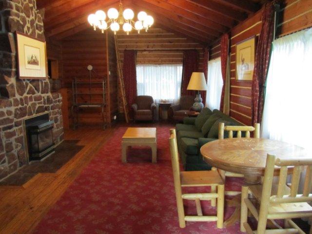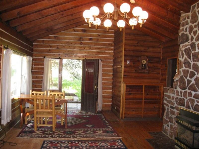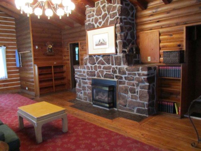 | Flashback: Settlers cabin, like its name, was one of the first houses the Deane family built, after their little cabin they first settled in burned to the ground thanks to the Thanksgiving Turkey. The cabin shows the careful woodwork put into log homes of that era, including interlocking oak floor with wooden pegs, white accent chinking, built in cabinets with antler handles in the kitchen, built in bookcases and a grand stone fireplace. | |