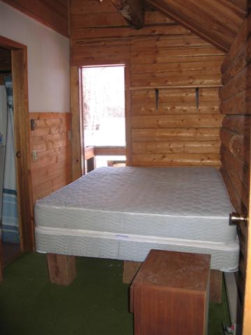 New carpet not shown - bedroom has a full/queen bed, with door from apartmet, door to bathroom, and door outside. Large closet with chest of drawers.